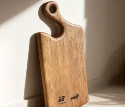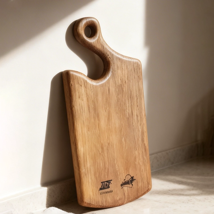 Разделочная доска была выполнена из натурального массива дерева, в индивидуальном дизайн заранее согласованный заказчиком. Форма доски, имеет эргономичное отверстие, которое позволяет надежно держать доску одной рукой. Кольцо для хранения на ручке доски, удобно для хранения и сушки.