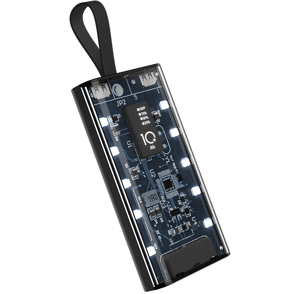 Портативный аккумулятор емкостью 10 000 мАч — это не просто источник энергии, а стильное и футуристичное устройство, которое выделяется своей уникальной конструкцией. Одна часть корпуса выполнена из прозрачного материала, через который прекрасно просматривается современная электронная плата и индикатор заряда батареи, создавая эффект технологичного модуля будущего.