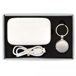 Подарочный набор в элегантной цветной картонной коробке серого цвета с конструкцией крышка-дно. Внутри расположены аккуратно закрепленные на ложементе внешний аккумулятор емкостью 10000 mAh с быстрой зарядкой, и металлический карманный брелок. Внешний аккумулятор обладает компактным дизайном и обеспечивает надежный запас энергии для мобильных устройств в пути, а стильный металлический брелок станет практичным и эстетичным аксессуаром для ключей. Этот набор идеально подходит в качестве презента для тех, кто ценит удобство, качество и современный стиль.
