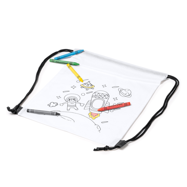 Рюкзак на кулиске из нетканого материала с дизайном для раскрашивания. 5 карандашей в разных цветах в комплекте.