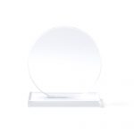 Стеклянная награда круглой формы с прямоугольным основанием. Включает черный презентационный футляр.