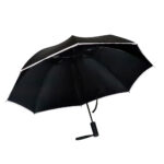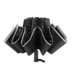 Автоматический противоштормовой складной зонт-наоборот Flash reverse со светоотражающей полосой – реверсивный зонт в необычном дизайне. Реверсивный (обратный) способ складывания/раскладывания купола выполнен таким образом, чтобы мокрая сторона спряталась внутрь. Зонт как бы вывернут на изнанку. В итоге внутренняя (сухая) сторона становится наружной, а та, что намокла от дождя, остается внутри. Легким движением — купол выворачивается в обратную сторону (противоштормовая функция). Материал купола – эпонж со светоотражающей кромкой. Вы будете замеченным со светоотражающими полосами зонта и останетесь в безопасности в темную дождливую погоду. На материале зонта вода превращается в капельки и скатывается, а сам зонт остается сухим. Ветрозащитная функция – спицы из стекловолокна, а специальное устройство препятствует поломке спиц при резких порывах ветра.