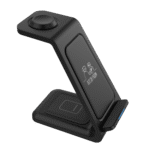 Беспроводное зарядное устройство, включающее 3 области для зарядки телефона, часов и наушников. На лицевой стороне имеется подставка под телефон, а также световая индикация.