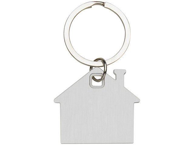 Брелок для ключей в форме домика с цветной вставкой из пластика между 2-мя серебристыми пластинами из стали.