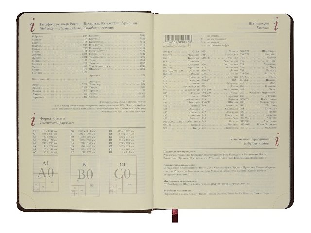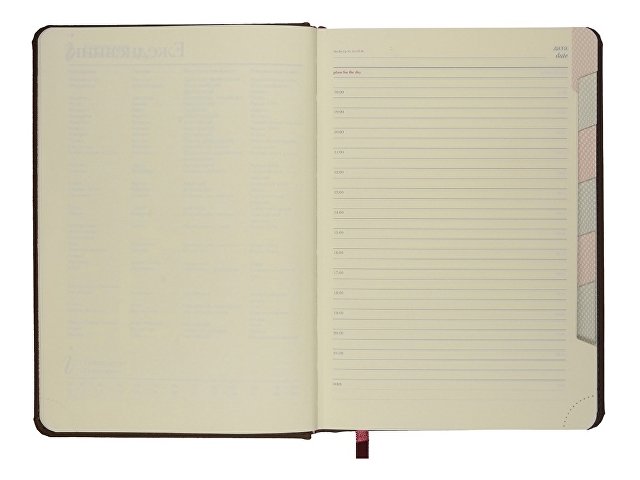 Незаменимый помощник в деле эффективного планирования благодаря высокому качеству производства и тщательно продуманных элементов: мягкая бархатистая обложка со скругленными уголками и строчкой по периметру в цвет, вырубные индексы с цветной маркировкой, разбивающей блок на месяцы, закладка-ляссе, перфорированные углы блока, линовка листов с указанием времени суток.