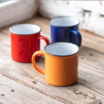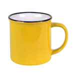 Кружка всем знакомой формы из советского прошлого. Она прочно обосновалась как в рознице, так и на рынке бизнес сувениров. Это своего рода ретро маркетинг, когда продукт имеет эмоциональную ностальгическую привязку к прошлому, к чему то родом из детства. Яркие цвета, черный кант Цвет близкий к Pantone 298C