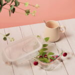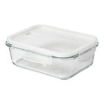 Ланч-бокс из боросиликатного стекла с пластиковой крышкой.Благодаря четырем зажимам и силиконовому уплотнителю по всему периметру крышки, она является полностью герметичной.Для 100% герметичности крышки рекомендуется использовать ланч-бокс для жидкости с температурой не более 60 градусов Боросиликатное стекло отличается особой прочностью и жаростойкостью. Впервые боросиликатное стекло появилось в 19м веке и было использовано для сигнальных фонарей. Фонари из обычного стекла быстро лопались из-за перепада температуры, в то время как эти фонари горели и в зимнюю стужу. После этого жена химика, создавшего прочное стекло, попросила попробовать его в духовке для выпечки пирога. Форма из такого стекла выдержала выпекание без нареканий. Вскоре боросиликатное стекло получило всеобщую популярность и стало широко применяться в фармацевтике, детской продукции и, конечно, при изготовлении различной посуды. Индивидуальная упаковка — коробка из белого дизайнерского картона
