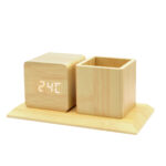 Многофункциональные деревянные часы с белой подсветкой и подставкой под канцелярские принадлежности. Функции: часы, дата, температура, 3 режима будильника, функция управления звуком (когда функция управления звуком активирована, дисплей гаснет через 15 секунд; вы можете активировать, дисплей хлопнув в ладоши, или слегка постучав по часам). В промежуток времени 18.00-7.00 яркость подстветски снижается на 50%. Источник питания: от сети, либо с использованием 3х батареек ААА (не входят в комплект). Поставляются вместе с русскоязычной инструкцией и USB кабелем для подключения к сети.
