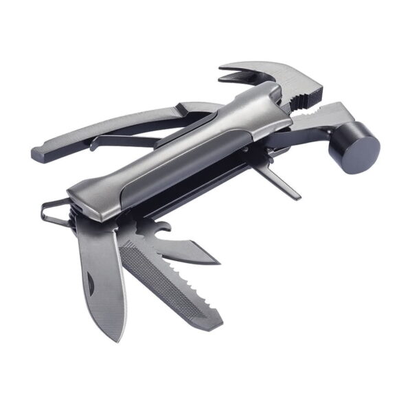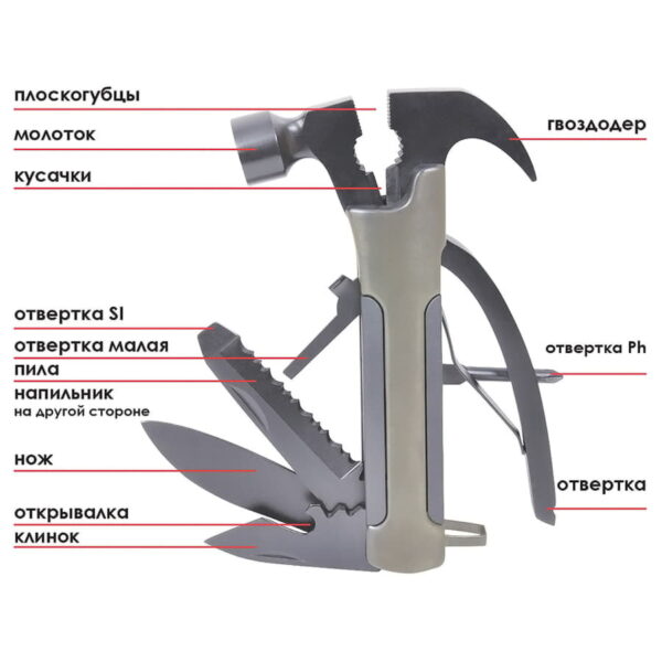13 функций в одном! Молоток, кусачки, 4 отвертки, плоскогубцы, гвоздодер, нож, напильник, пила, открывалка, клинок. Чехол на ремень. Универсальный инструмент для хозяйственных работ и туризма.