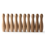 Набор деревянных кеглей с 10 кеглями и 2 шариками. Удобный хлопковый мешочек для переноски. Упаковка в коробке с эко-дизайном.