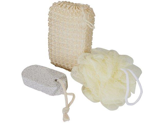 Набор из трёх банных аксессуаров для полноценного ухода за телом. В комплект входят мочалка-люфа для мягкого очищения кожи, пемза для ухода за стопами и губка из натурального мексиканского сизаля для лёгкого массажа и отшелушивания. Все принадлежности удобно хранятся в практичном мешочке из полиэстера — компактно и стильно.