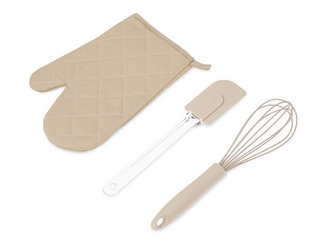 Набор Canele состоит из трёх предметов, без которых не обходится приготовление ни одного пирога или торта: венчика для взбивания яиц или крема, лопатки и прихватки для горячего.
