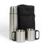 Универсальный набор с термосом на 0,5 литра и двумя металлическими кружками в удобном нейлоновом чехле с ручкой. Кружки, корпус термоса и колба выполнены из нержавеющей стали. Сохраняет тепло до 12 часов в зависимости от температуры окружающей среды. Набор удобно взять с собой в дорогу или на пикник.