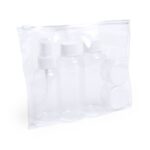 Дорожный набор косметичка FLAUTиз 5 аксессуаров в прозрачном дизайне. Включает в себя пять баночек: для геля, шампуня, крема с завинчивающейся крышкой, парфюмер с дозатором, корпус из ПВХ с герметичным уплотнением. 2 баночки для крема Ø 3,8 x 3 см, 20 мл. 2 баночки Ø 4,1 x 11,1 см, 120 мл. 1 Флакон-распылитель Ø 4 x 11,4 см, 90 мл. Материал: ПВХ ПП Размер набора: 20 x 18 x 4 см Вес: 85 гр.