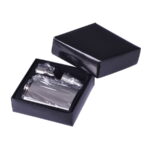Размеры фляжки: 13,6 см х 9,4 см х 2,2 см. Объем 235 мл. Размеры стопок: высота 4,3 см, диаметр основания 2,5 см, диаметр верхней части 3,3 см. Размеры воронки: высота 4,6 см, диаметр верхней части 3,9 см.