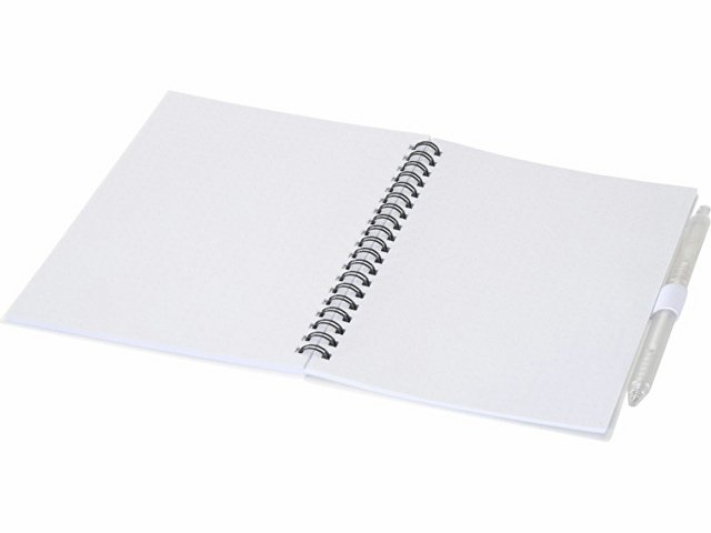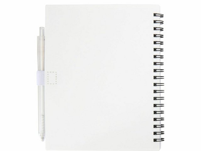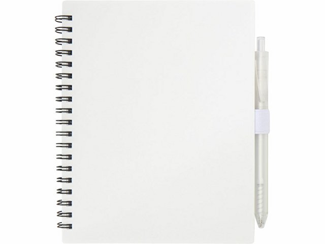 Блокнот Niove с мягкой обложкой изготовлен из переработанной пластмассы, имеет 70 нелинованных листов из бумаги плотностью 70 г/м². Блокнот имеет квадратные углы и петлю для ручки. Размер блокнота: 140 х 178 мм. Шариковая ручка также изготовлена из переработанной пластмассы. Цвет чернил: синий. Длина непрерывной линии: 1000 метров. Диаметр пишущего узла: 1,0 мм.