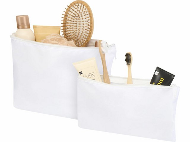 Набор из 2 косметичек, изготовленных из переработанного полиэстера. Полиэстер имеет сертификат GRS. В комплект входят одна большая и одна маленькая косметички. Легкие, прочные и удобние для хранения косметики или электроники. Большая сумка имеет размер 32 х 21 см, а маленькая 23 х 13 см.