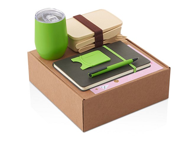 Материал товара | картхолдер — силикон , термокружка — нержавеющая сталь , блокнот — термо PU с зернистой структурой , ручка — пластик с покрытием soft-touch , ланчбокс — 50% пшеничное волокно , 50% ПП-пластик , открытка — бумага , коробка — картон |