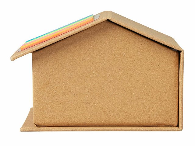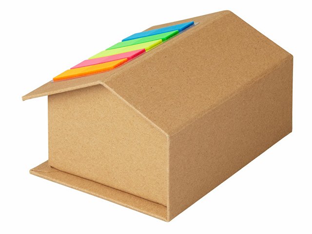 Набор стикеров и бумаг для записи в виде домика. На крыше домика расположены стикеры, 5 цветов по 25 штук каждого цвета. Внутри домика — 400 листов белой бумаги для записей плотностью 70 г/м2.
