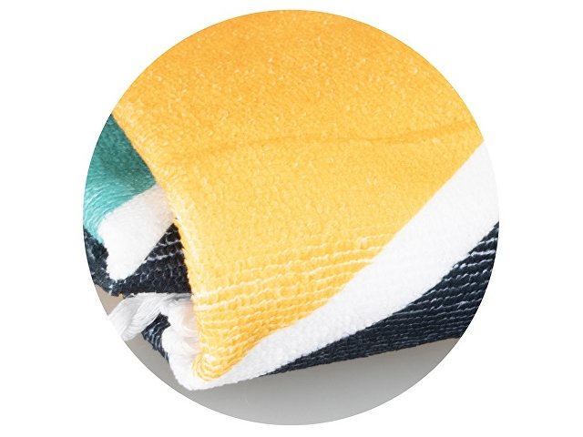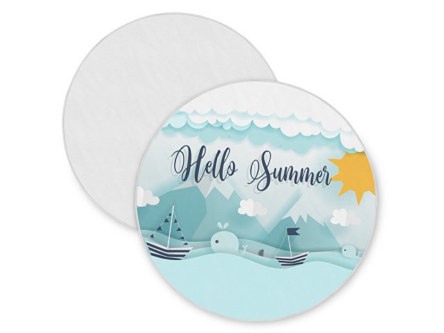 Необычный и трендовый вариант классического пляжного аксессуара. Круглая форма полотенца помогает быстро и удобно расстилать его на земле или шезлонге. Плотный полиэстер сохнет быстрее обычных тканей, поэтому полотенцу не требуется дополнительная упаковка после использования — достаточно ненадолго развесить его для просушки. Полноцветная печать на полотенце производится с помощью сублимации. Бахрома по краю может быть изготовлена в двух цветах (белый и чёрный) на выбор клиента.