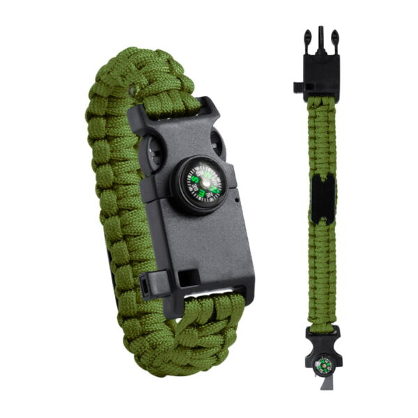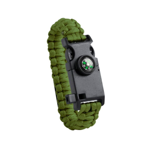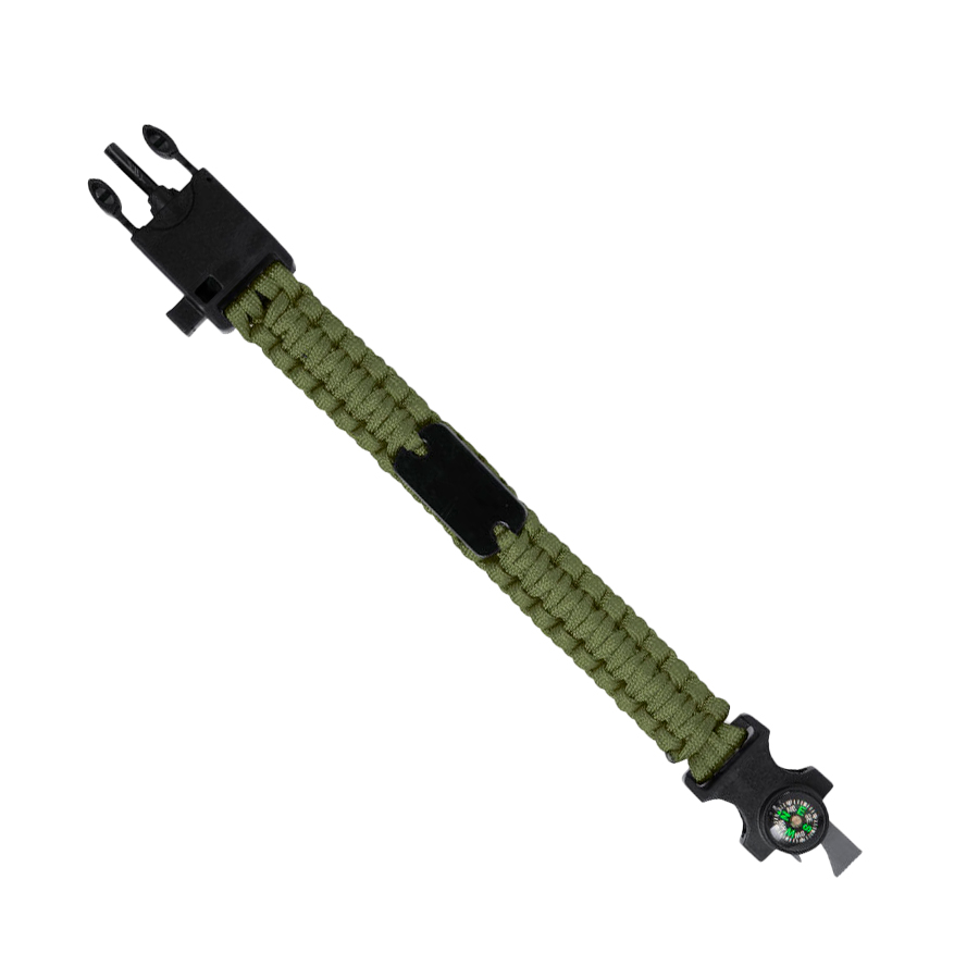 Многофункциональный походный браслет. Выполнен из прочного нейлона (паракорда). Включает в себя 4 функции: компас, свисток, кремневый скребок (при ударе его о металл выскакивают искры) и открывашка. Отдельно стоит отметить удобную застежку.