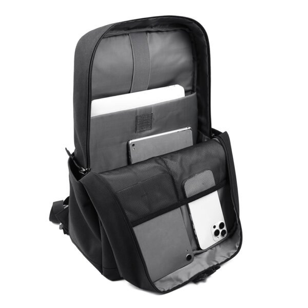 Внутри заднего отделения уплотнённый карман для ноутбука 17 дюймов с клапаном-резинкой на велькро и карман-органайзер из сетки для аксессуаров.