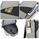 Одно большое отделение закрывается молнией со скрытым звеном. Внутри большой уплотненный карман для ноутбука 15,6 дюймов с клапаном на велькро и карман-органайзер для мелких аксессуаров. На передней стенке два больших скрытых кармана на молнии , боковой открытый карман и USB-разъем с проводом для подключения внешнего аккумулятора. Уплотнённая короткая ручка для дополнительного комфорта рук. Уплотнённые плечевые ремни регулируются по длине.