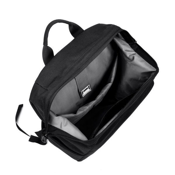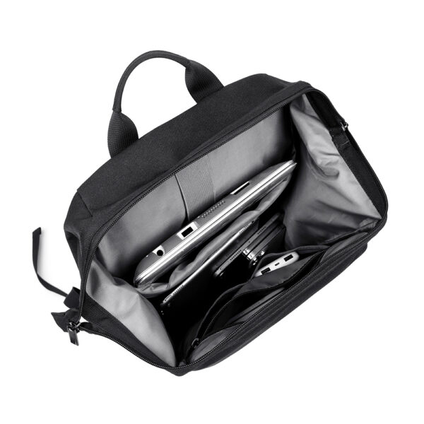 Его особенности — жесткие фиксаторы верхнего края придающие форму «а-ля саквояж», элегантный внешний вид и обеспечивающие отличный доступ в рюкзак. Основное отделение закрывается на молнию с двумя пуллерами.