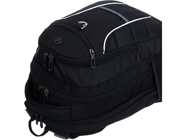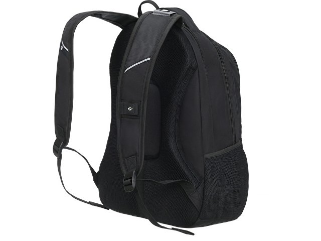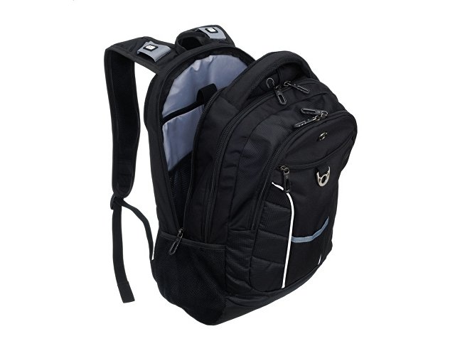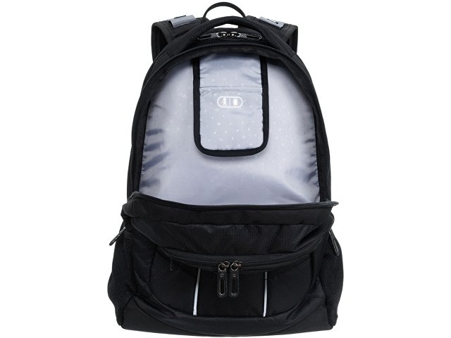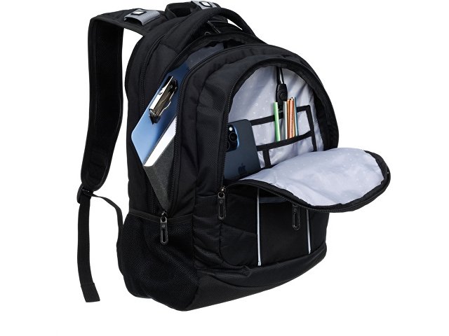 Рюкзак оборудован специальным отделением для ноутбука с диагональю экрана 15″. По бокам рюкзака расположены два сетчатых кармана для бутылок с водой или зонта. Рюкзак имеет специальное отделение для телефона или зарядного устройства с отверстием для наушников/проводов.